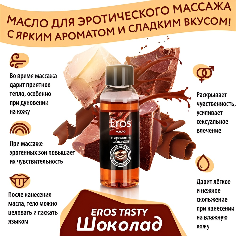 Массажное масло "Eros Tasty" - идеальное средство для эротического массажа с приятным ароматом шоколада, которое окутает Вас облаком сладости и неги!