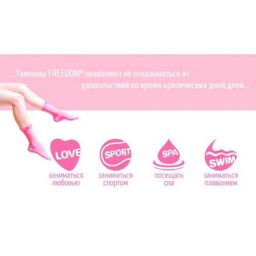 Заниматься любовью, спортом, плавать в бассейне, танцевать, встречаться с друзьями в СПА или отдыхать на пляже – с FREEDOM все это возможно даже в критические дни.