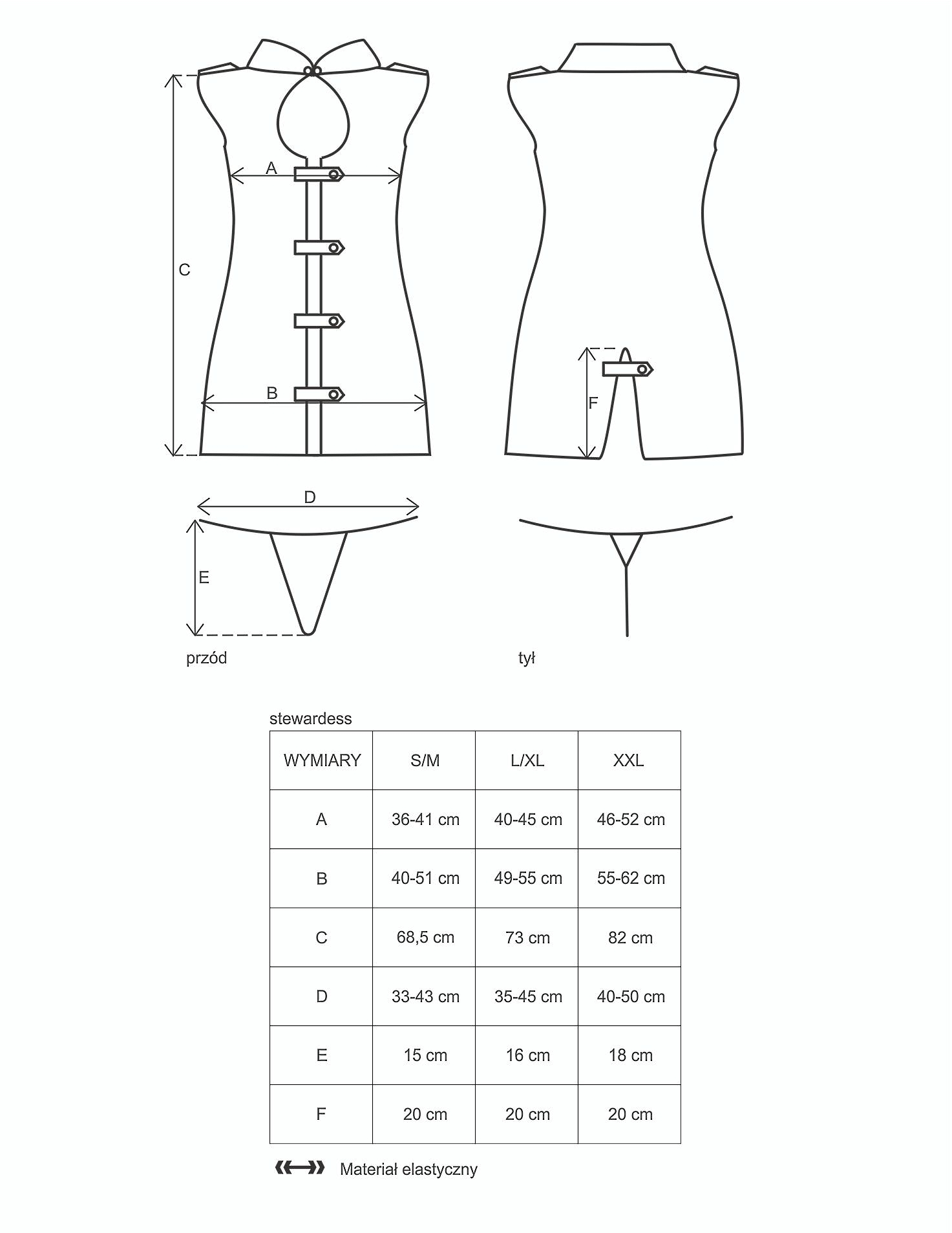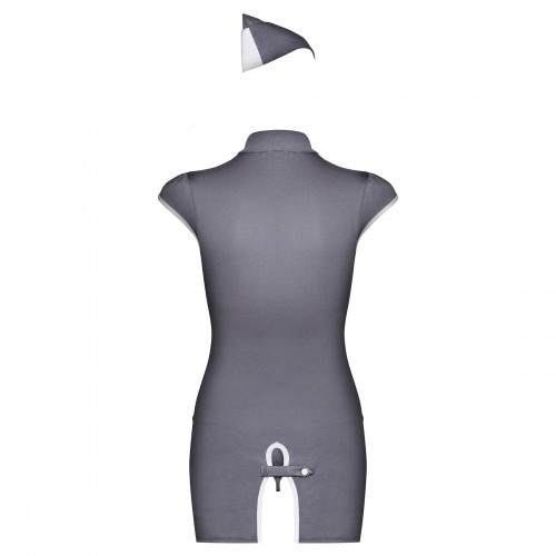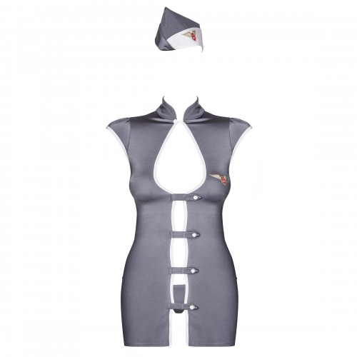 Детали: облегающее платье с воротником-стойкой и короткими рукавами; разрезы поперек всего платья соединяются при помощи застежек; глубокое декольте подчеркивает грудь; маленький разрез сзади обнажает ягодицы; благодаря эластичной ткани платье красиво очерчивает фигуру; пилотка стюардессы со значком авиалиний; гигиеническая ластовица на трусиках.