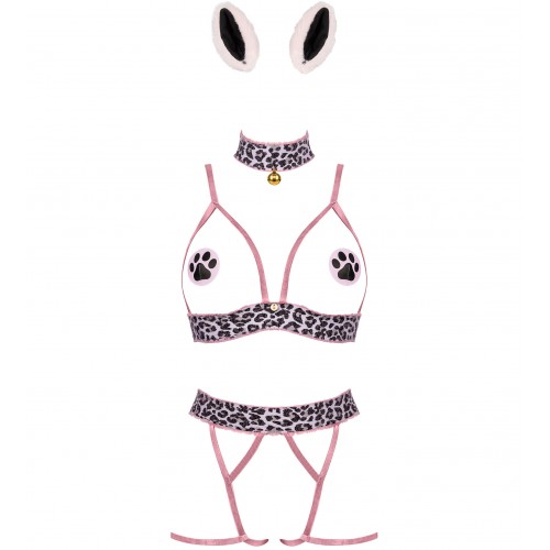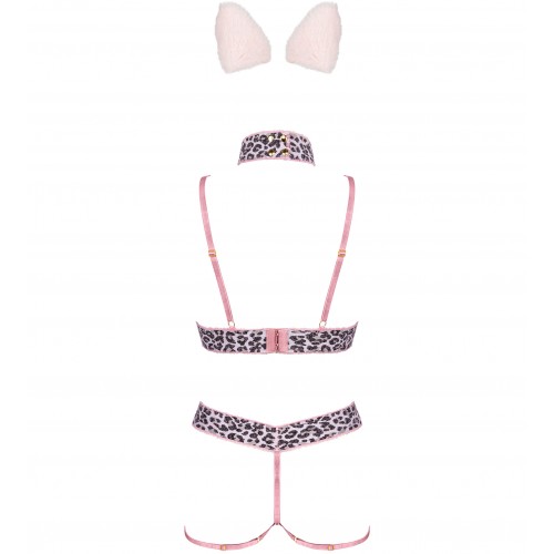 Детали: сексуальный комплект с анималистичным принтом; лиф с открытыми чашками без косточек; тонкие бретели не отстегивается, регулируется по длине; застегивается на спине крючками; пояс для чулок с открытыми стрингами; завышенная линия талии; чокер и ушки дополняют образ.