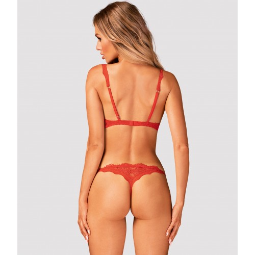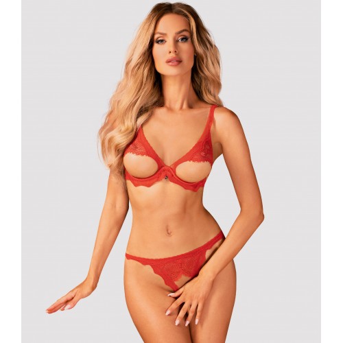 Бюстгальтер имеет полуоткрытые чашки. Сверху грудь дразняще обтянута нежной тканью, а снизу поддерживается косточками, искусно скрытыми кружевом.