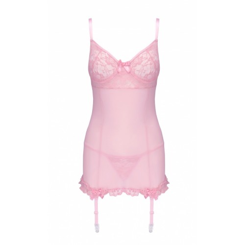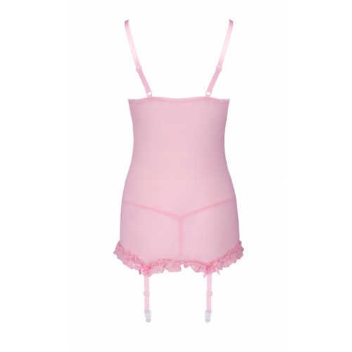 Полупрозрачная сорочка Rabia светло-розового цвета c подвязками для чулок. Чашечки мягкие на косточках, бретели регулируются по длине. Низ сорочки украшает оборка.