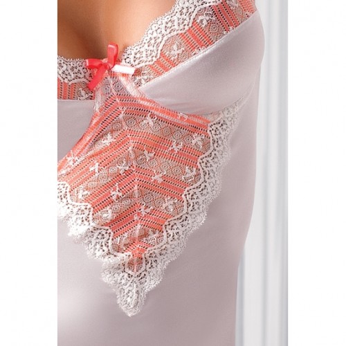 Лиф на косточках украшен кружевом терракотово-бирюзового цвета. Внимание к декольте привлекает персиковый атласный бантик.