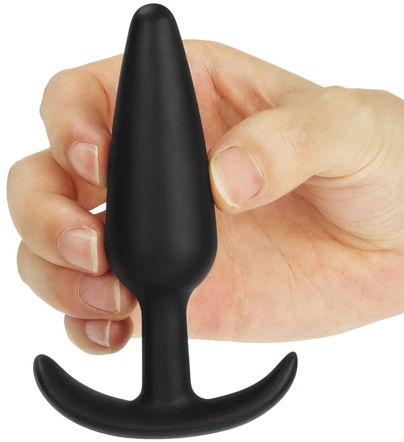 Упругая анальная пробка изготовлена из безопасного силикона и имеет высоту 10 см до ограничителя и диаметр в пределах 1-2,5 см.