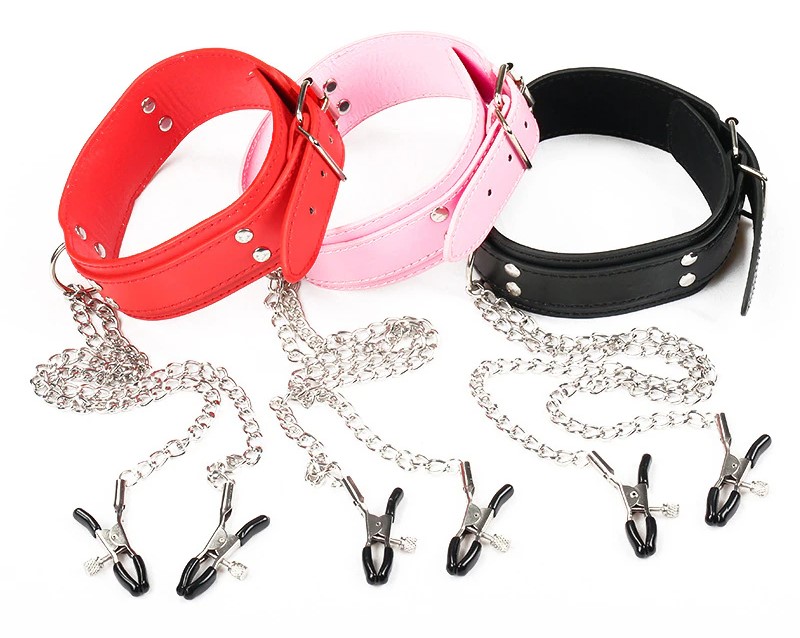 Красный ошейник с зажимами для сосков на металлических цепочках послужит прекрасным дополнением для ролевых игр и БДСМ практик.