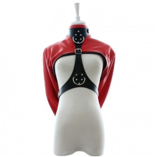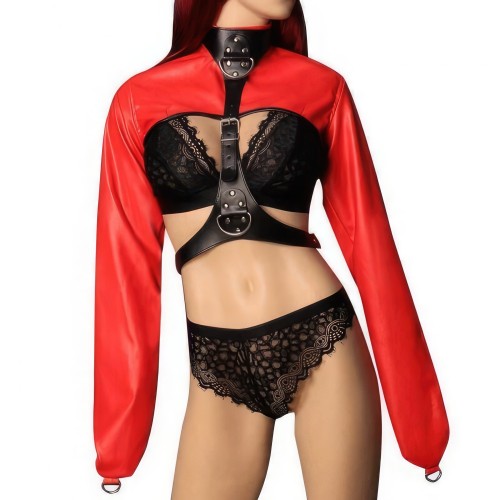 На рукавах без отверстий для кистей есть небольшие полукольца, которые можно соединить между собой цепочкой или карабином (в комплект не входят). На ошейнике также есть полукольца более крупного размера, к которым можно присоединить другие бондажные аксессуары, чтобы разнообразить сценарии игры. Размер жакета регулируется при помощи ремешков с пряжками.