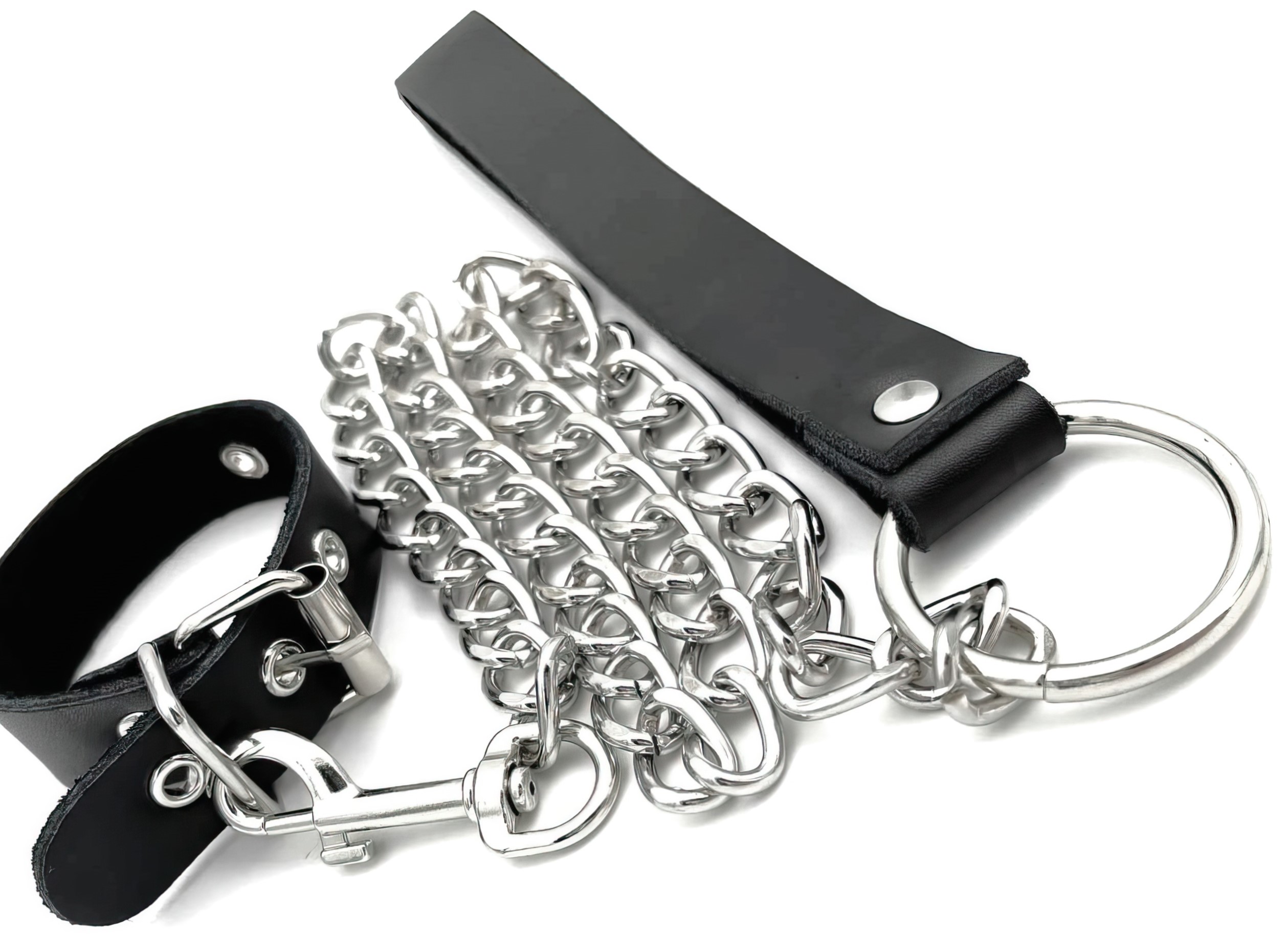 Изделие представляет собой узкий ремешок, плотно обхватывающую член, и длинный металлический поводок, который придает аксессуару еще более дерзкий внешний вид.