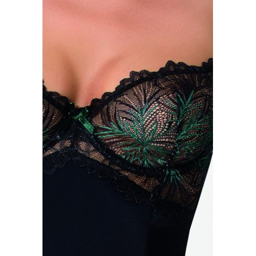 Черная облегающая сорочка на тонких бретелях с ажурным лифом. В комплекте прилагаются трусики стринги.