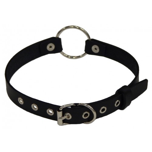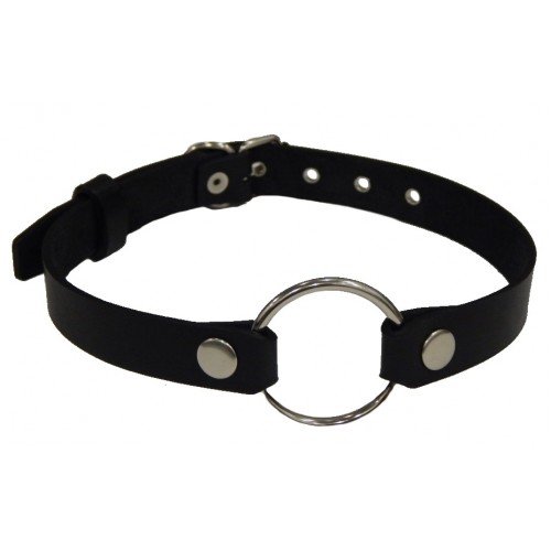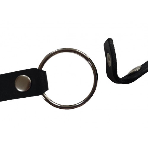 Кольцо держится на кожаных ремеш­ках, кото­рые крепятся на затылке, фик­си­руя кляп.