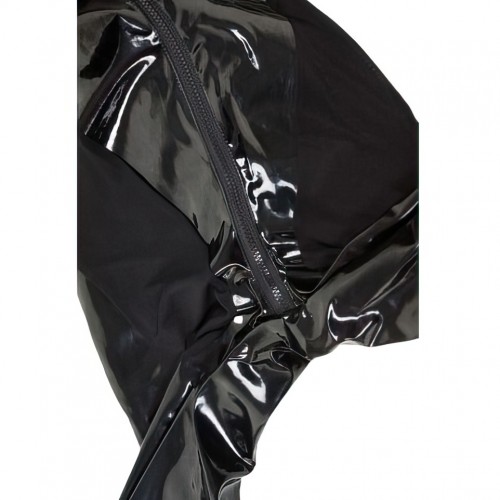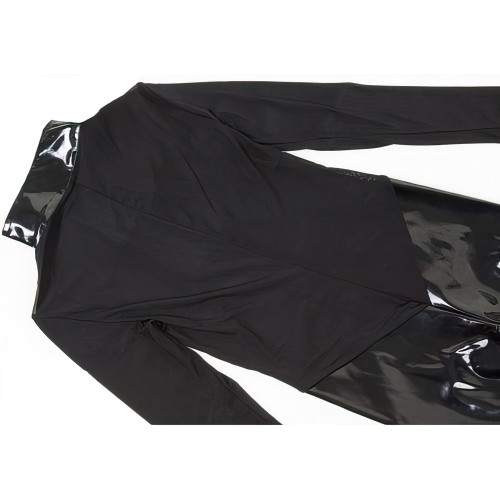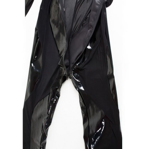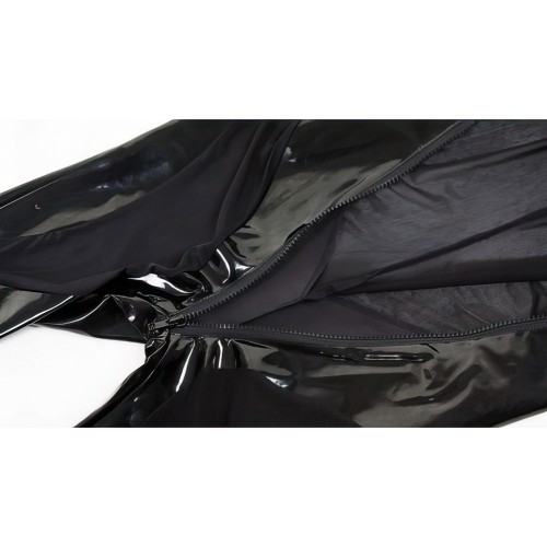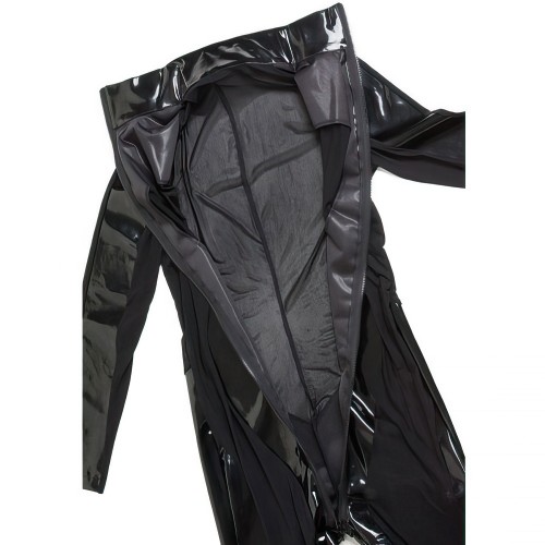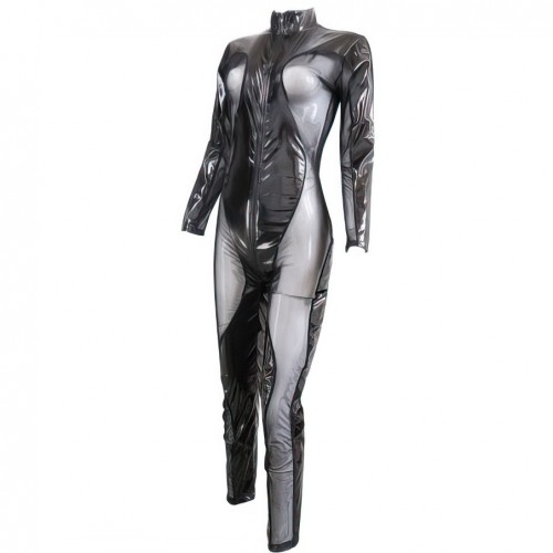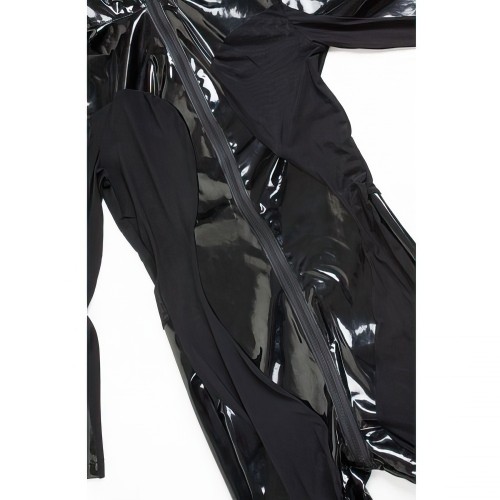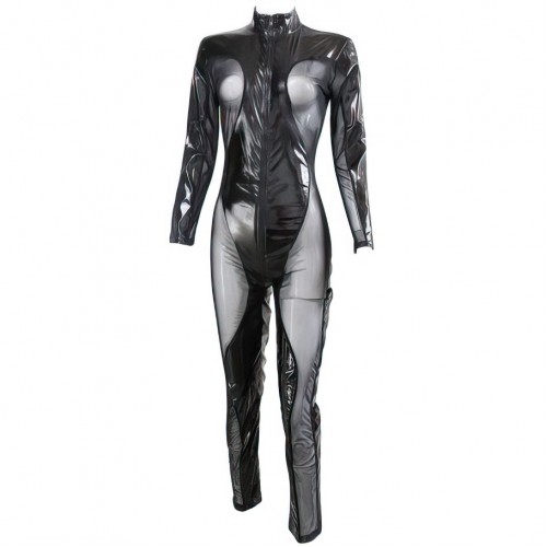 Благодаря молнии он открывает и обнажает зону декольте, а полупрозрачная сеточка просвечивает самые желанные части тела грудь и ягодицы, а также подчеркивает и делает стройнее талию.
