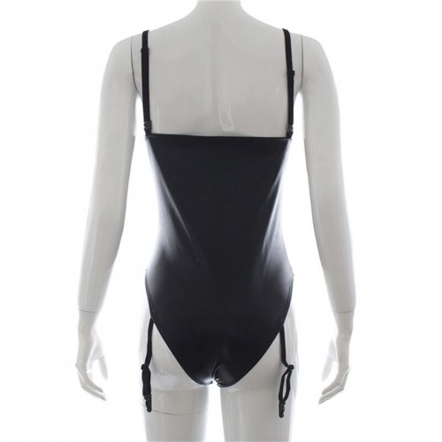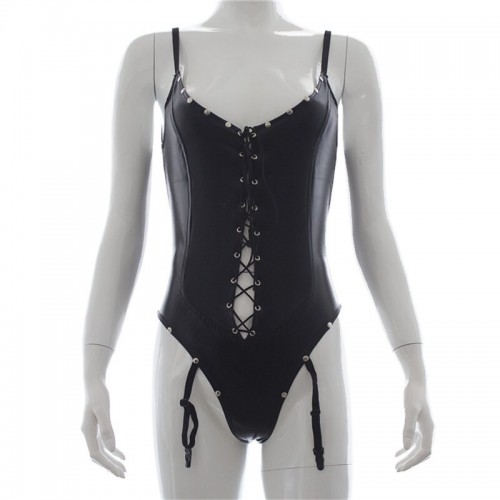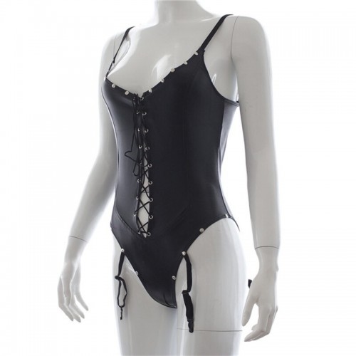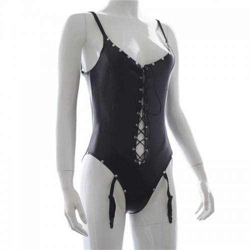 Классическое боди в современном дизайне: с подтяжками, металлическими заклёпками и шнуровкой впереди.
