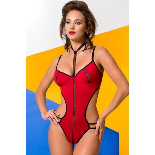 Боди выполнено из мягкой эластичной ткани красного цвета с черными бретелечками, чашечки бюста и передняя часть боди декорированы узкими вставками из черной сетки, имитирующими застежку молнию, отчего эта модель боди смотрится очень соблазнительно и эффектно!