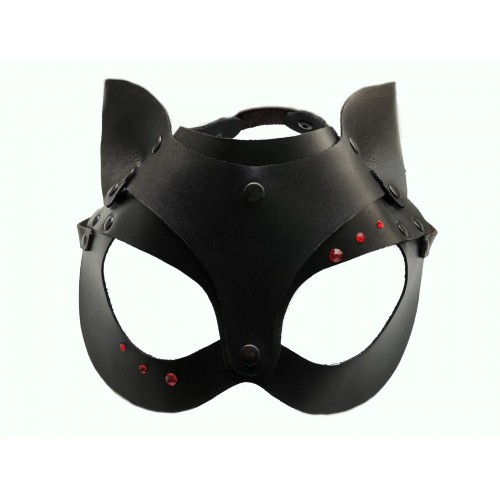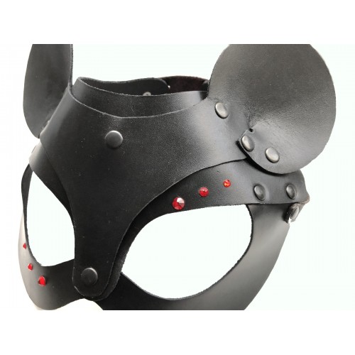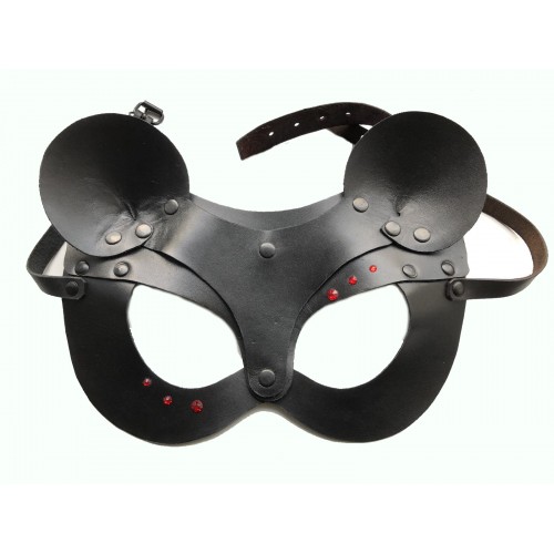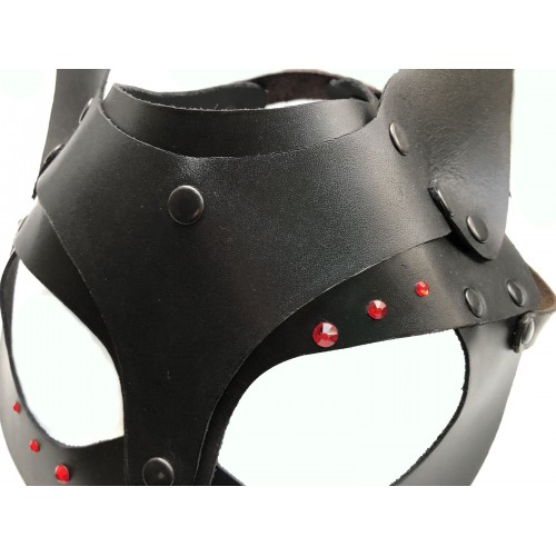 Кожаная чёрная маска со стразами и ушками Hand Made