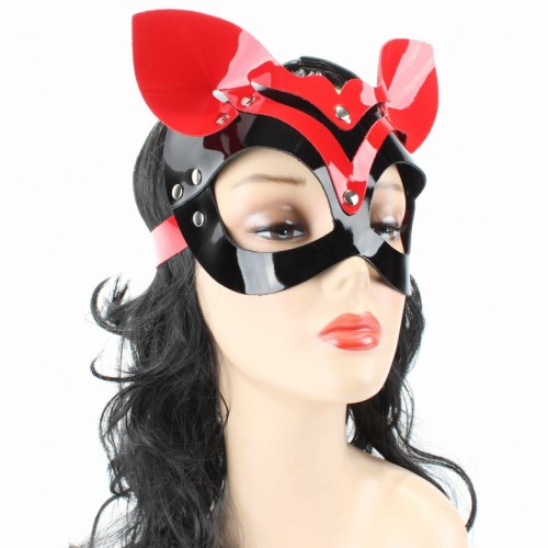 Маска кошки черно-красная, выполненная из лакированной кожи, с металлической фурнитурой, сзади регулируюется ремешками.