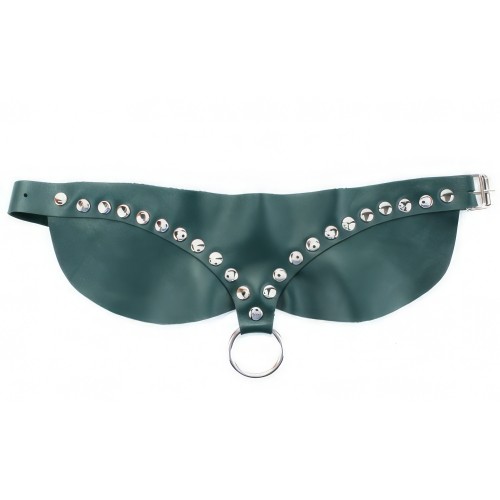 Ошейник выполнен из натуральной кожи изумрудного цвета, декорирован заклепками в виде V символа и металлическим кольцом спереди. Сзади аксессуар надежно фиксируется пряжкой, ремень позволяет выбрать нужный размер.