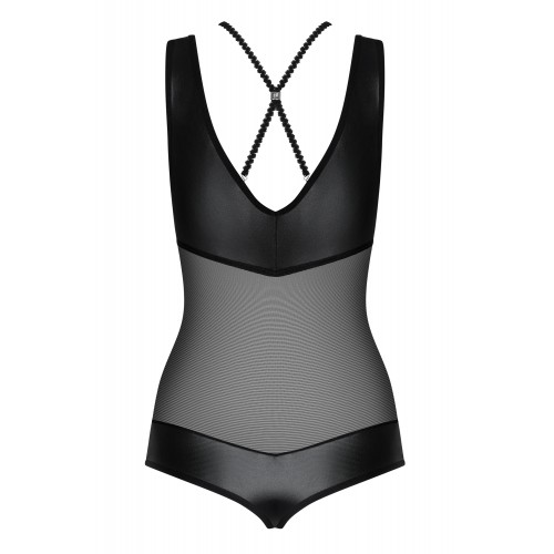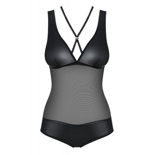 Детали: боди с добавлением блестящего материала - сексуальный «Wet Look», интригующие полоски, пересекающие декольте и спинку, серебряные украшения на стыке полос, специальная строчка на груди - визуально делает форму груди соблазнительнее, прозрачная черная сеточка - эротично подчеркнет животик и спинку, красивая, нежная, идеально эластичная ткань Multistretch.