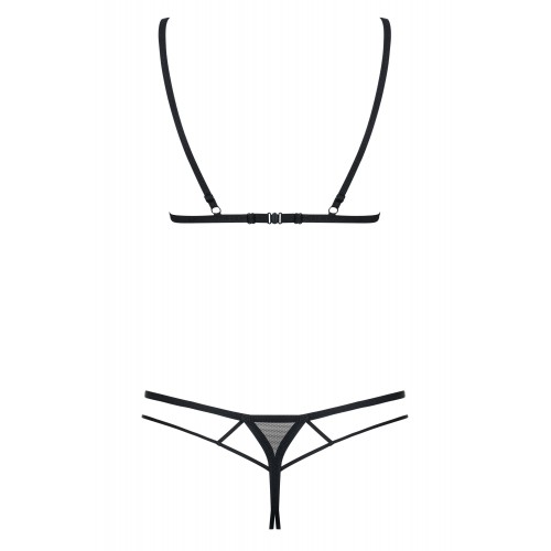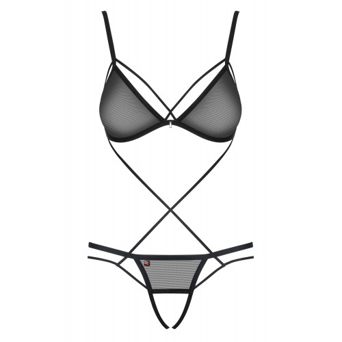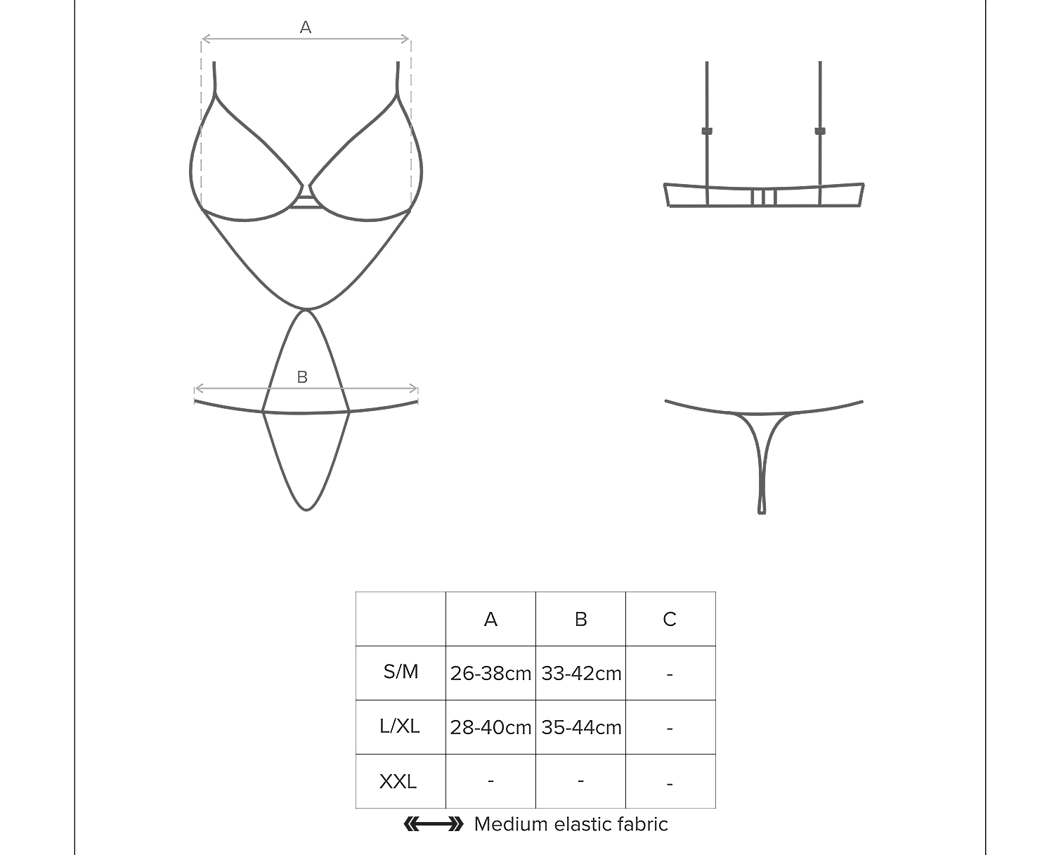 Детали: необычное сочетание - бюстгальтер, стринги и бретельки, облегающие тело, регулируемые бретели, регулируемая застежка на спине - идеальная посадка, уникальное украшение на бюстгальтере, стринги с открытой промежностью - гарантия незабываемых ощущений, деликатные эластичные ткани