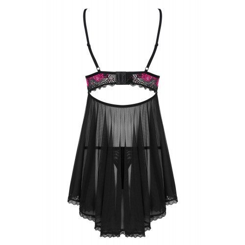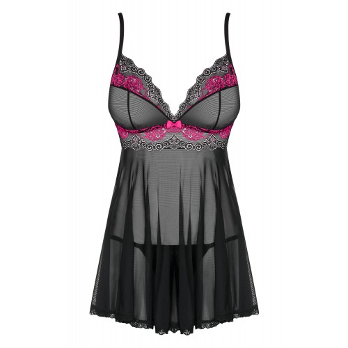 Детали: милый беби-долл с розовым цветочным узором, регулируемые лямки - идеальная посадка, многоступенчатая застежка на спине, мягкие чашки, украшенные кружевом - красивый вид бюста, узор под бюстом добавляет шарма, соблазнительный розовый бант, прозрачная, черная сетка, воздушный крой с чуть удлиненной спинкой, деликатные и эластичные ткани.