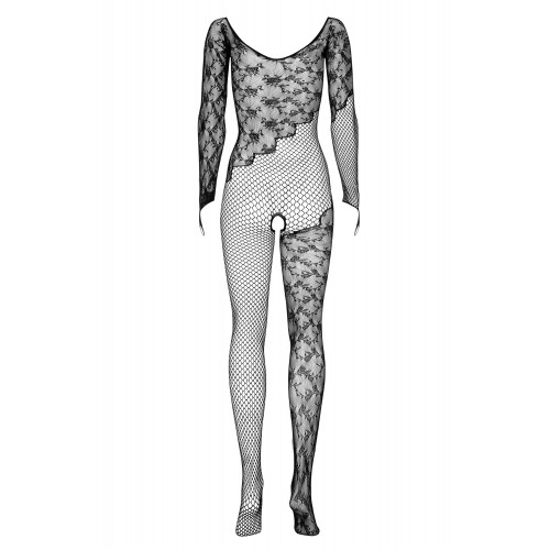 Детали: глубокий, подчеркивающий декольте вырез, длинные рукава с прорезью для пальцев, все декорировано цветочным узором, умело сочетающимся с сеткой, открытая промежность, очень красивый, эластичный материал.