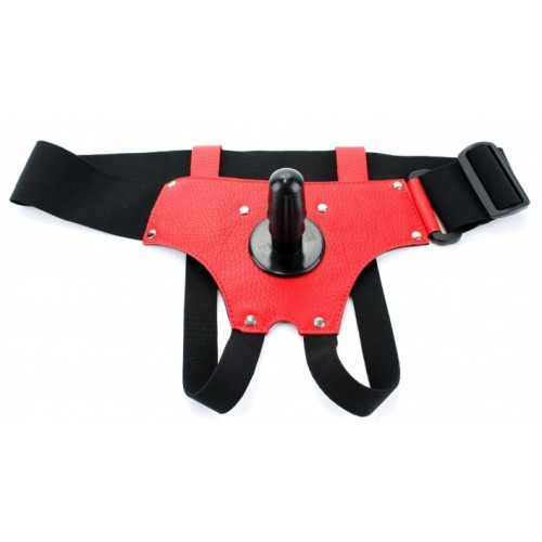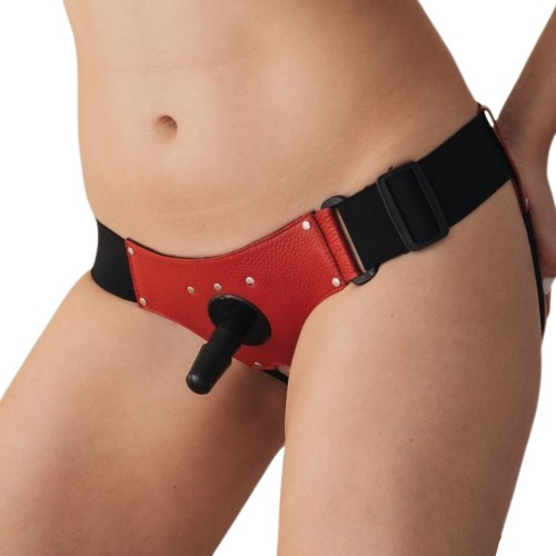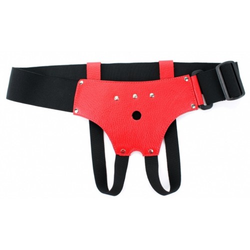 Трусики выполнены из натуральной кожи красного цвета с элементами из черных эластичных резинок, надежно фиксирующих изделие на теле.