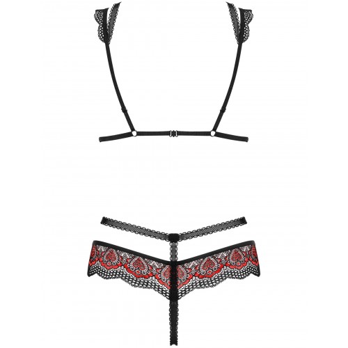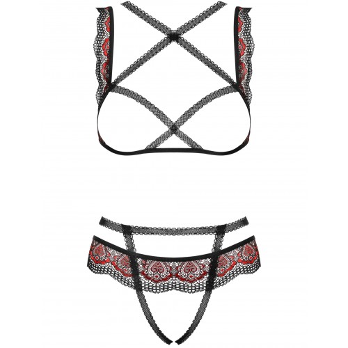 Детали: открытый комплект Megies выполнен из кружева черного и красного цветов, открытый бюстгальтер с кружевом - добавит пикантности, декорированные кружевом регулируемые бретельки и застежка обеспечат идеальную посадку, кружевные трусики-стринги с открытой промежностью - залог острых ощущений и красивого вида ягодиц, эластичная и мягкая ткань Multistretch.