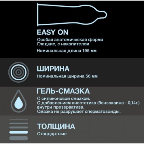 В упаковке 12 презервативов анатомической формы с накопителем.