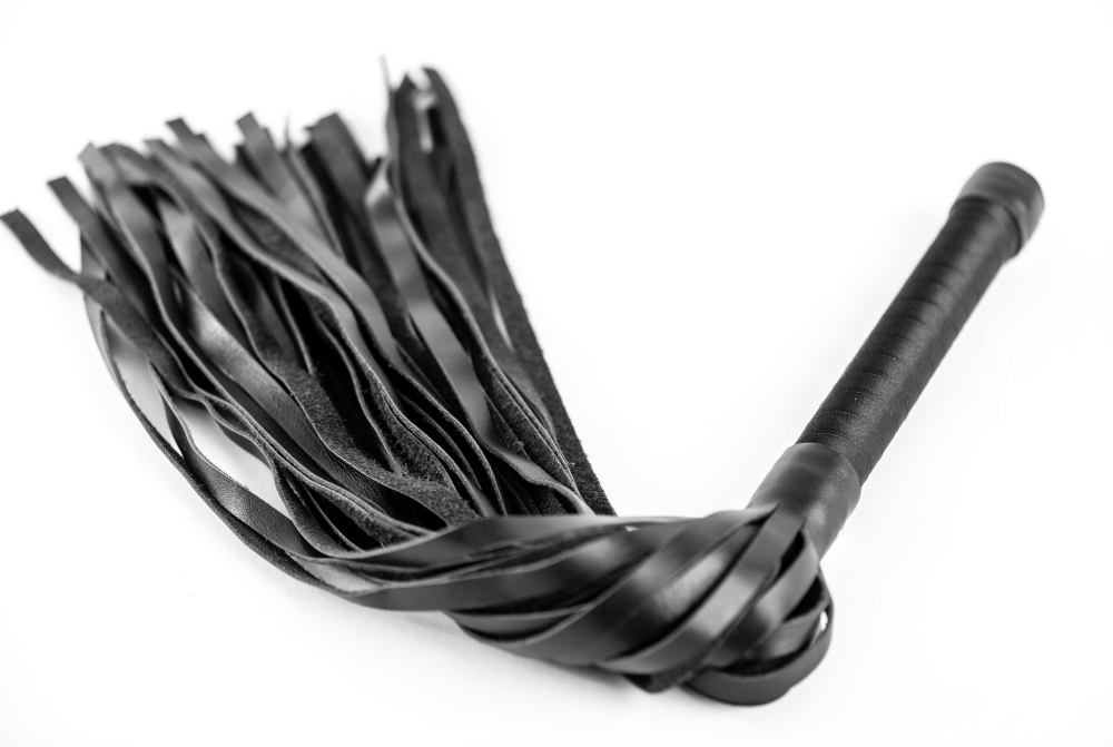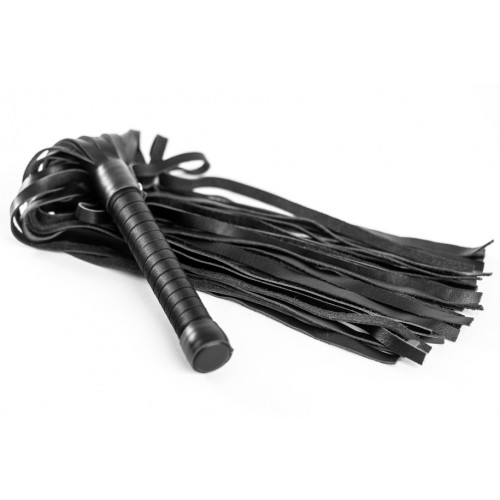Ручка плети декорирована черной атласной лентой. Плеть имеет 34 мягких кожаных хвоста.