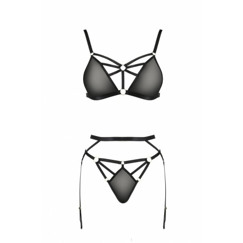 Черный эротический комплект нижнего белья Meggy выполнен из полупрозрачного тюля и эластичных ремешков-резиночек, красиво соединенных между собой металлическими колечками.