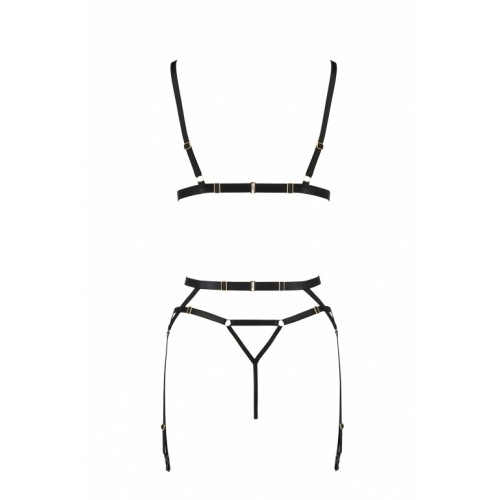 Комплект состоит из лифа, пояса для чулок и трусиков-стринг.