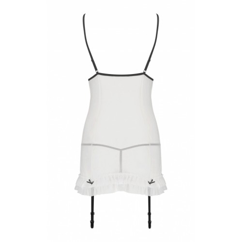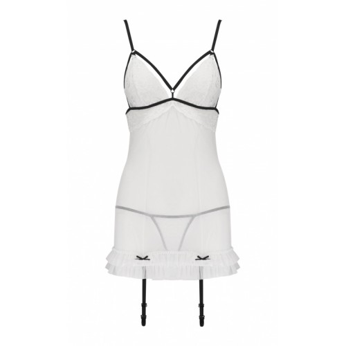 Эротическая сорочка белого цвета с подвязками для чулок, выполнена из полупрозрачного тюля и эластичного кружева.