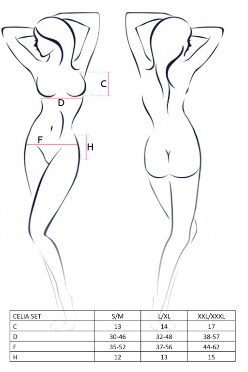 Эротичный комплект состоит из полупрозрачного бюстгальтера, миниатюрных трусиков и пояса с пажами для чулок.