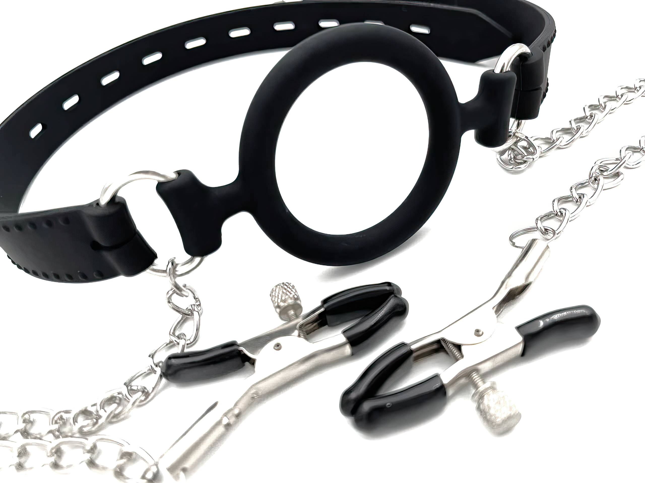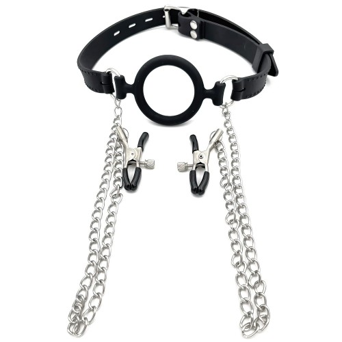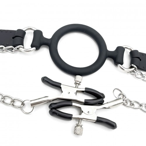 Черный силиконовый кляп-кольцо с зажимами для сосков