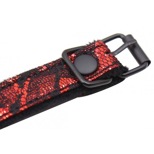 Силиконовый кляп на фиолетово-черном ажурном ремне