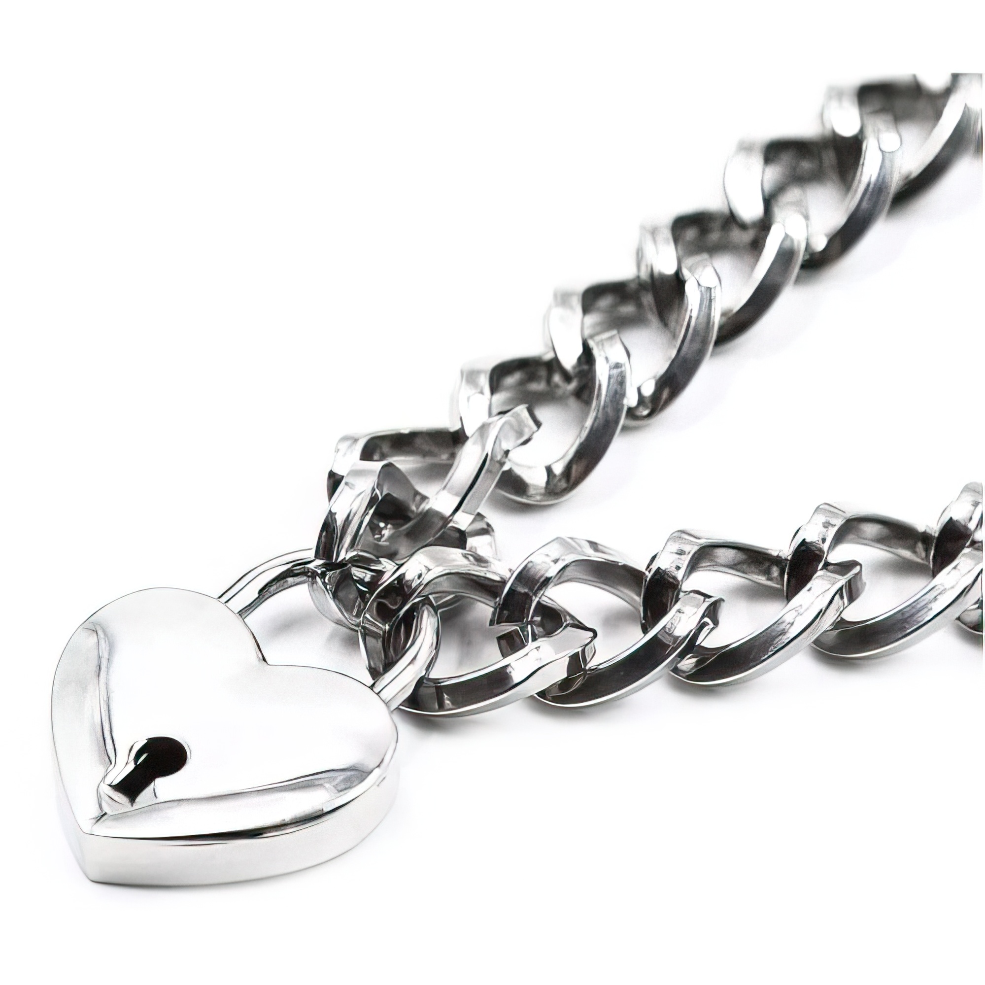 Аксессуар выполнен из металла и имеет вид классической цепи, но замочек-сердце добавляет ему особой дерзости.
