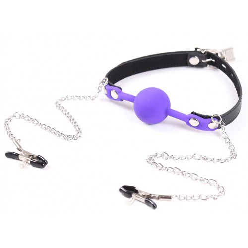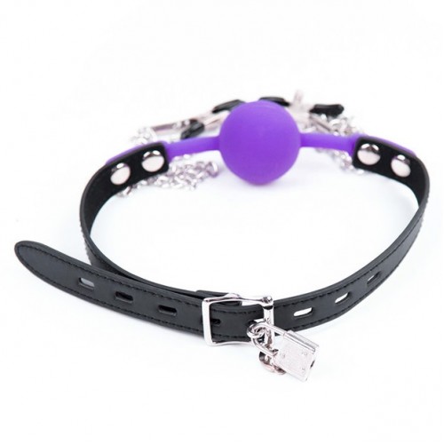 Силиконовый пурпурный кляп с зажимами для сосков и замочком