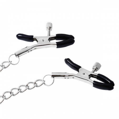 Сила сжа­тия сос­ков регу­ли­ру­ется метал­ли­че­скими винтами, а окончания зажимов покрыты рези­но­выми подкладками - это позволит не повре­дить неж­ную кожу груди.