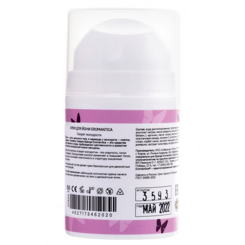 Крем Секрет молодости обогащён L-аргинином, который увеличивает синтез коллагена естественным для организма путём, восстанавливает эластичность тканей, борется с признаками их преждевременного старения и является мощным оружием против бактериальных и вирусных инфекций в интимной зоне.