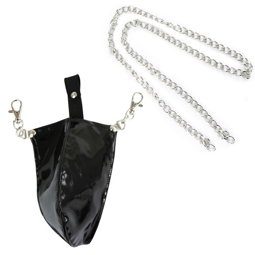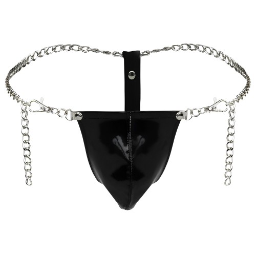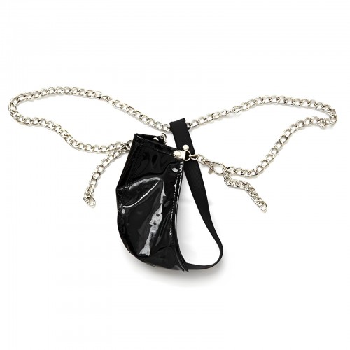 Эротические черные трусики-стринг выполнены из искусственной лакированной кожи и цепочкой.