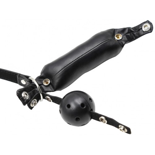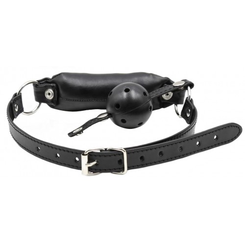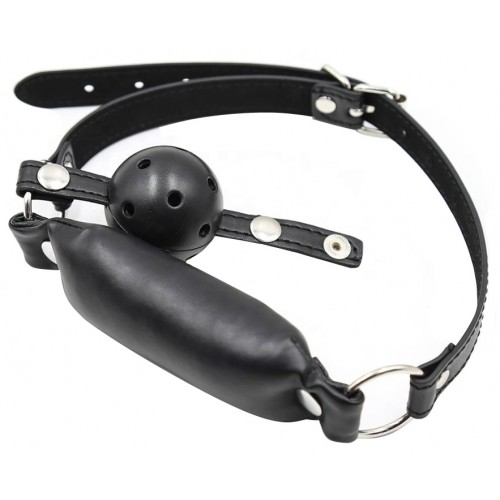 Кляп-шар выполнен из пластика и имеет дырочки для облегчения дыхания. Трензель невозможно выплюнуть, он надежно фиксируется при помощи ремешка, при этом удобен для использования.