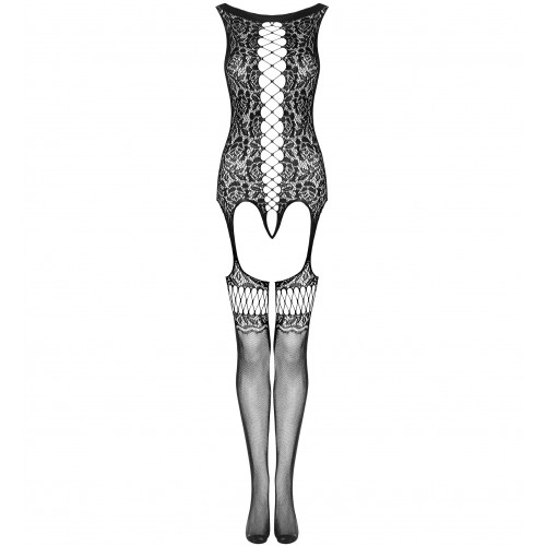 Боди соединяется с чулочками в мелкую сетку лаконичными пажами.