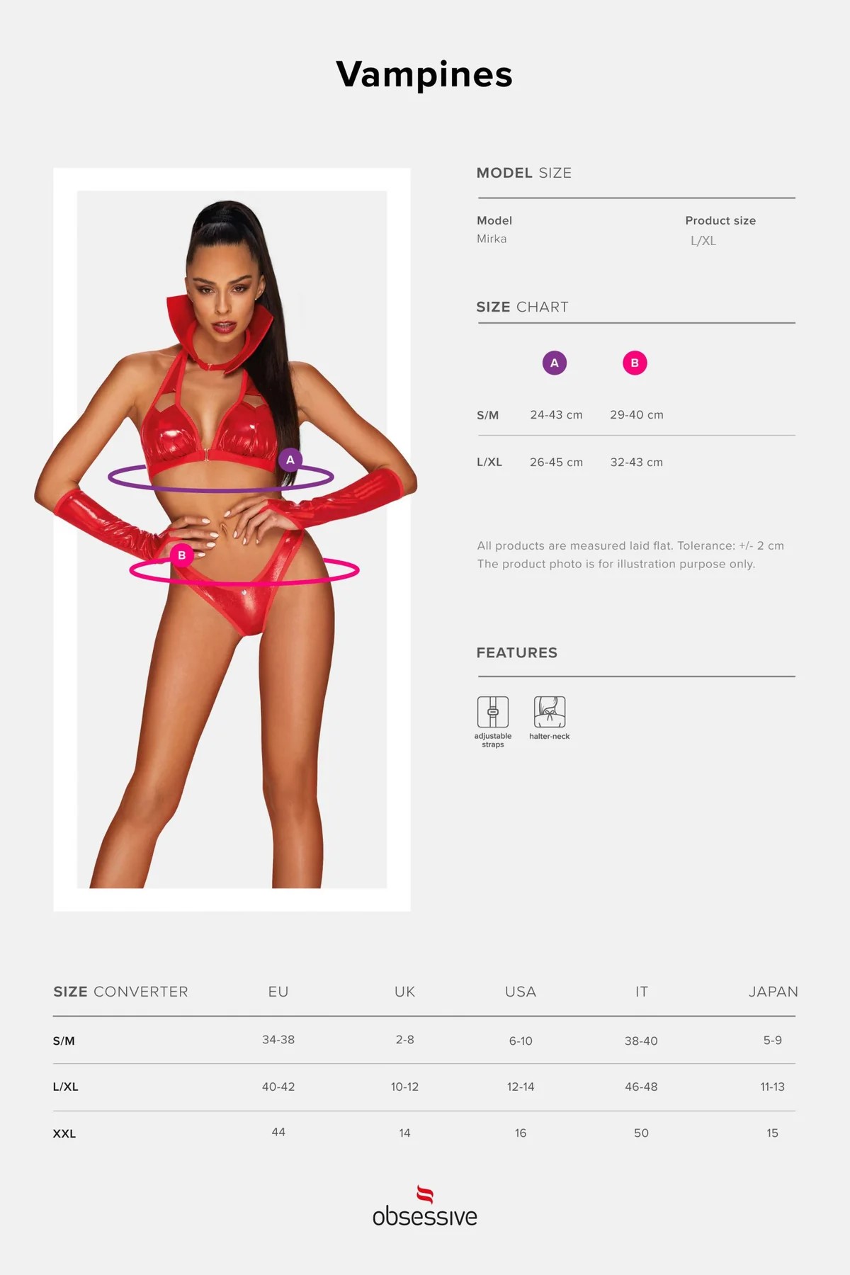 Детали: эротический костюм вампира; бюстгальтер с мягкими треугольными чашками поддерживает грудь, подчеркивает ее естественную форму; без косточек; треугольные чашки с вырезами переходят в широкую бретель через шею застежка спереди; трусики стринг с V-образной линией талии; сзади украшены шнуровкой; перчатки и воротник дополняют образ.