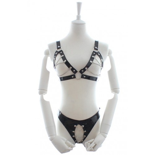 Лиф из лакированных ремешков приподнимает грудь, придавая женским формам еще большую привлекательность.