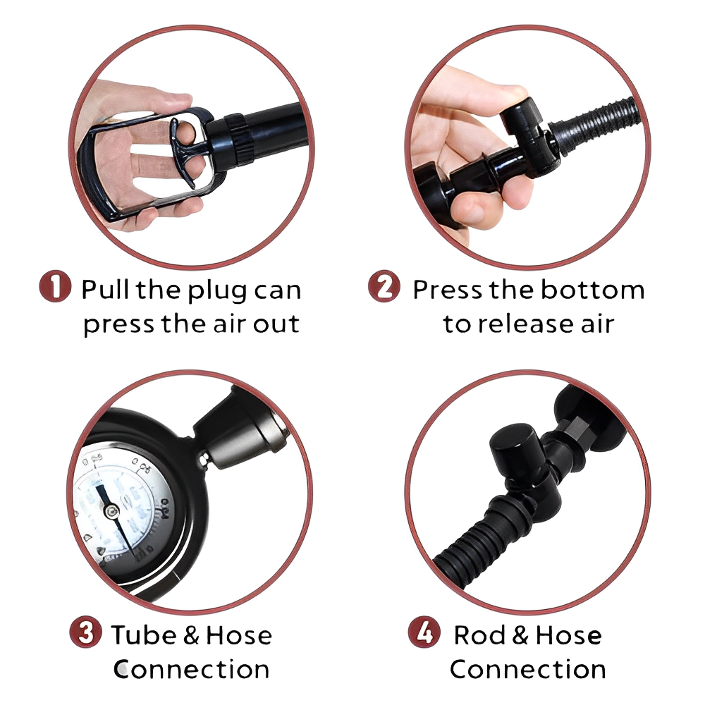 Воздух откачивается при помощи вакуумного шланга с удобным механизмом, оснащенным манометром, который показывает степень давления внутри колбы.