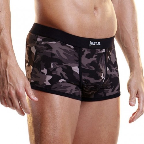 Камуфляжные обтягивающие боксеры серых оттенков из мягкой и удобной микрофибры на узкой черной резинке с фирменной нашивкой Hustler.